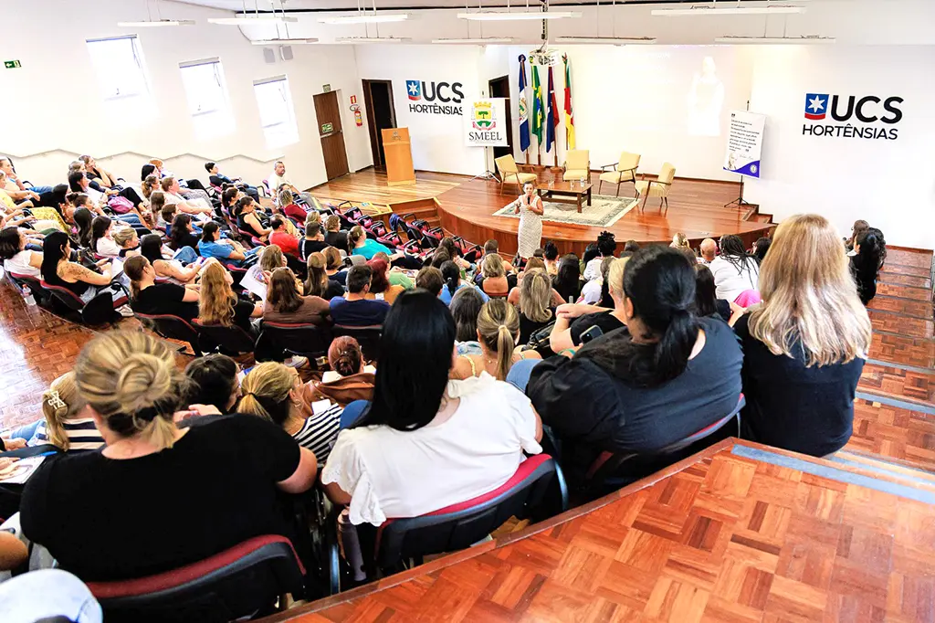 Na quarta-feira (18), um dia antes da chegada dos estudantes, professores, monitores e equipes diretivas participaram de capacitação no auditório do Campus Hortênsias da Universidade de Caxias do Sul (UCS). A formação foi conduzida pela especialista em Gestão Pública e Escolar, Márcia Adriana de Carvalho. O tema da apresentação foi “A contribuição individual e coletiva para a educação municipal – O papel de cada indivíduo na garantia do direito de aprender”. A atividade foi dividida em dois turnos, contemplando docentes dos anos iniciais, professores dos anos finais, educadores da EJAI e equipes gestoras.
