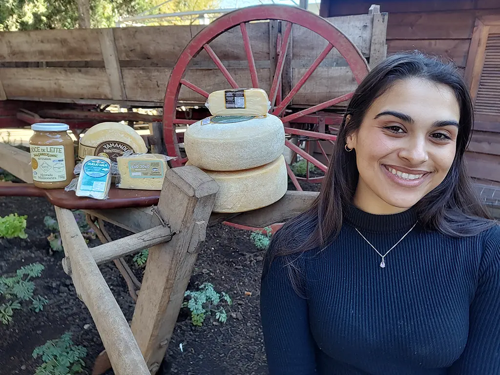 Também está se tornando tradição na Festa Colonial a participação da Queijaria Alvorada Missioneira. Maria Eduarda Kaefer (na foto) falou do orgulho em trazer para a Praça Corrêa o produto premiado que a sua família, metade canelense (por parte da mãe), metade missioneira (o pai é de São Paulo das Missões) faz com tanto esmero. Vanderlei Kaefer iniciou o aprendizado da queijaria na Alemanha e desenvolveu produtos quando trabalhou na ex-Fazenda Serra Azul, no Saiqui. Vendia, na Feirinha Ecológica, aos sábados, e durante a pandemia abriram a loja na estrada Gramado-Canela, próximo à entrada para o bairro São José. A Queijaria tem conquistado prêmios em âmbito estadual, nacional e internacional com o queijo Yamandu, marca registrada. Uma verdadeira grife com toque colonial, dando sabor extra à nossa Festa.e Rodrigo Batista. Os músicos da banda são Mateus Hehn, Nicolas Oliveira, Marcelo Clement,