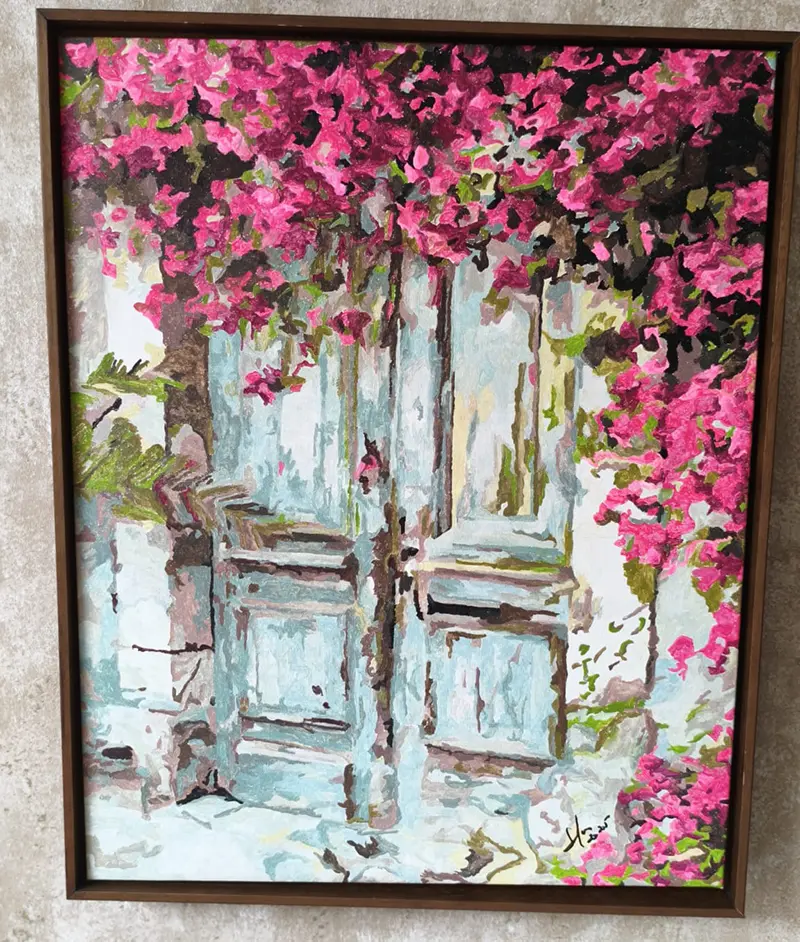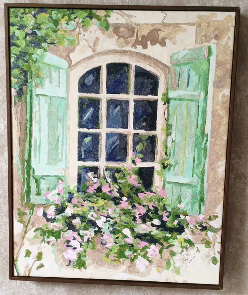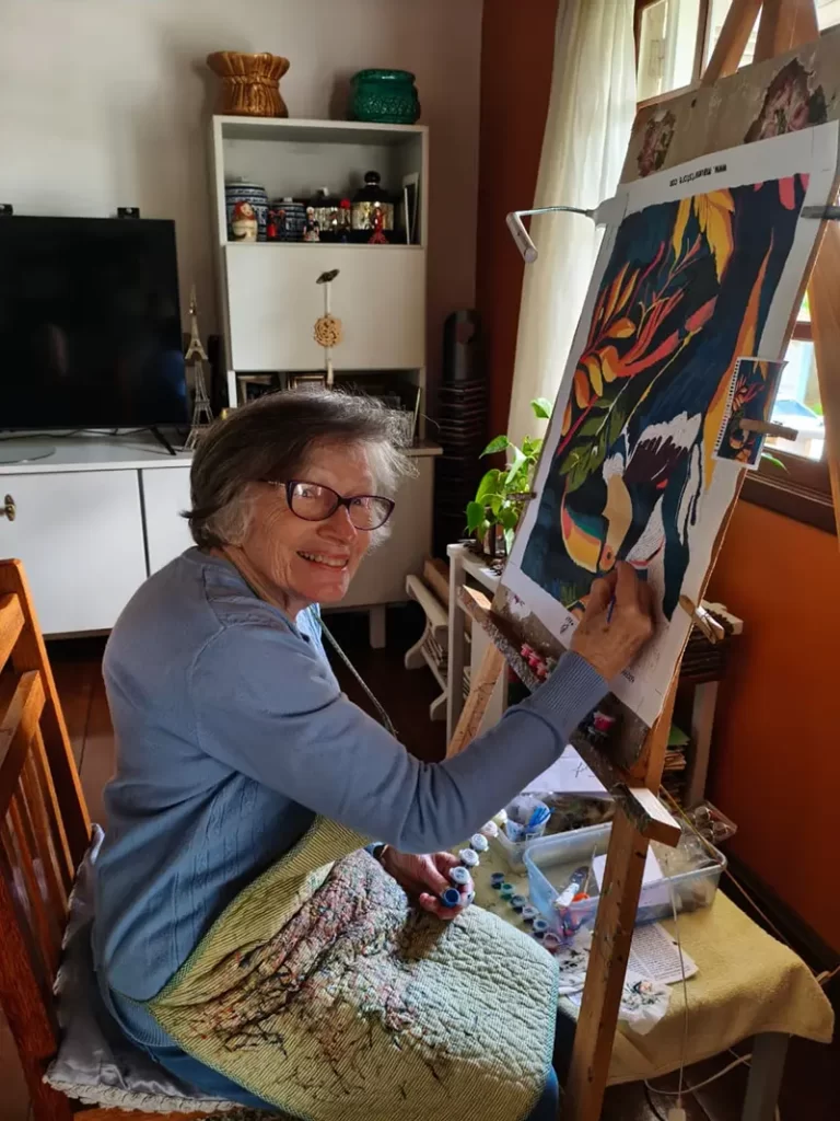 A pandemia propiciou à Dona Solores o contato com a pintura numerada, descoberta que se tornou paixão e originou dezenas de telas. Além das paredes da própria casa, os quadros multicoloridos são presenteados para a família e decoram também empreendimentos. Assinar cada pintura significa já pensar na próxima.