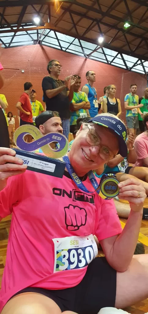 Rosane Costa Warken, 63 anos, representa uma delas. Ela é a personificação do prazer em correr, em qualquer idade e diz: “Correr, para mim, é uma forma de estar ligada aos colegas da academia, também corredores, que são pessoas que se encontraram com o objetivo de melhorar a saúde e o bem-estar. Na academia tive o incentivo para correr. Os treinos são muito organizados, as corridas em outras cidades, de 5, 10km, eu gosto demais. Cuido da minha saúde física e mental e, estar com pessoas do bem, interessadas umas com as outras, é muito especial”.