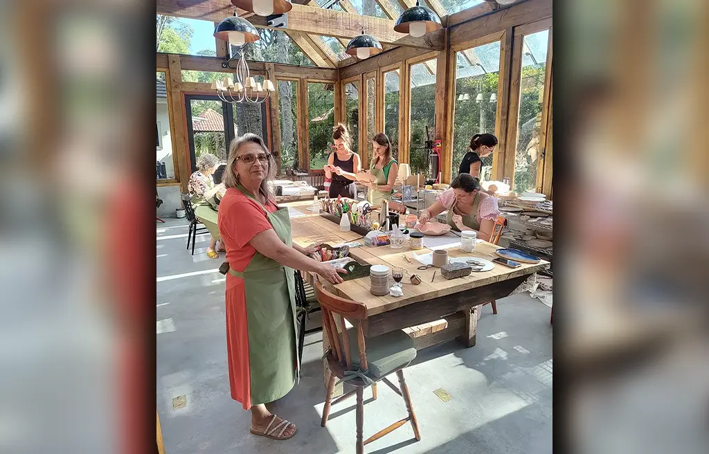 Nas palavras da idealizadora de um belo atelier de cerâmica recém-inaugurado em Canela, ele é “um espaço sonhado e construído com muito amor, em meio à natureza, onde a luz entra generosa e a criatividade encontra silêncio, presença e inspiração”. Profissional das artes e professora canelense que sempre repartiu técnicas e amor pela pintura, Débora Zanatta (em primeiro plano, na foto à direita) tem, neste novo espaço, mais um motivo de orgulho. Na sua carreira da muitos anos, tendo já ensinado mais de 100 alunas, ela se reinventa e passa a se dedicar também à criação de peças artísticas, decorativas e utilitárias a partir da argila (ou massa cerâmica) queimada.