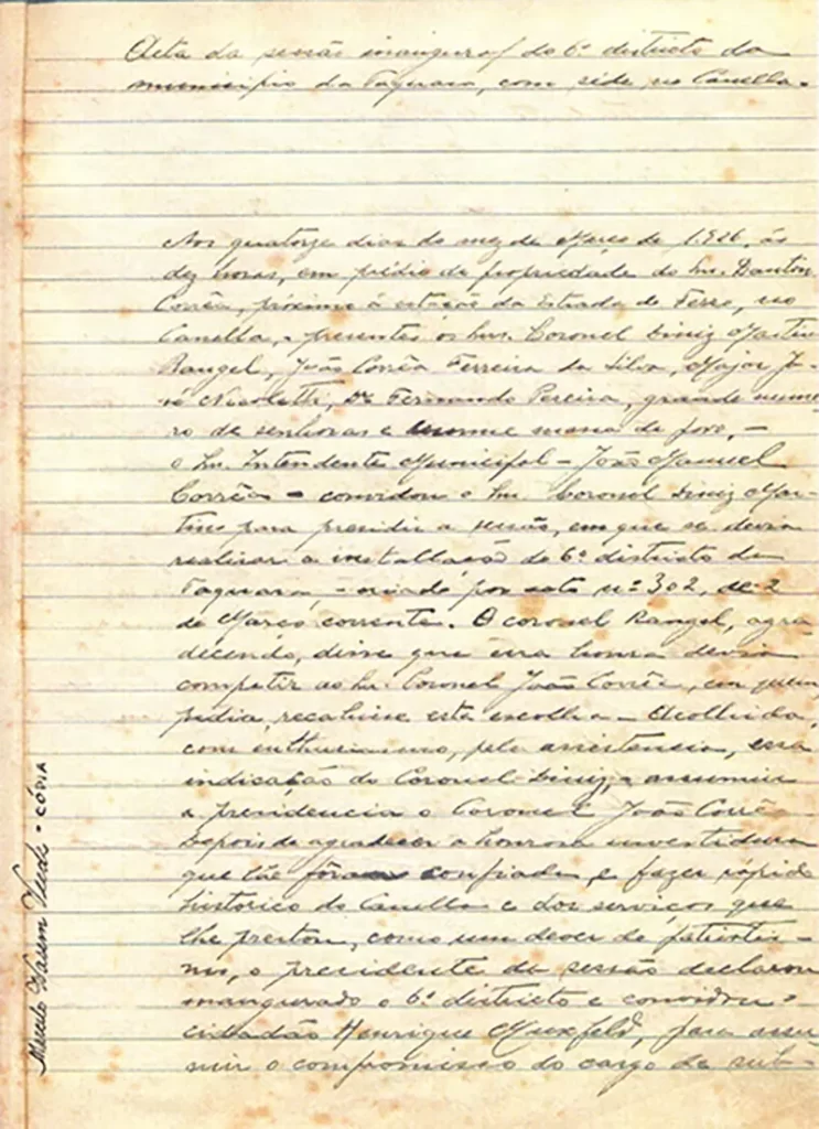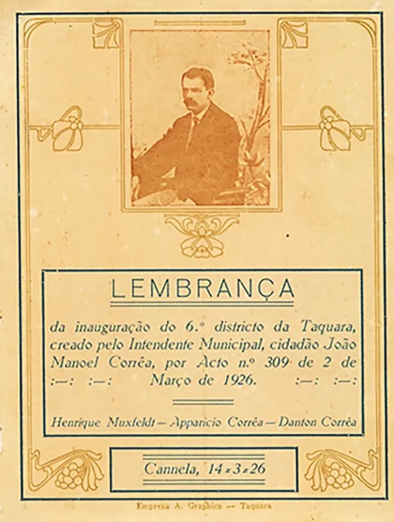 Na transcrição da Ata da Sessão de Instalação do 6º Distrito de Taquara consta data e hora: “Aos quatorze dias do mês de março de 1926, às 10 horas, em prédio de propriedade do Sr. Danton Corrêa, próxima da estação da Estrada de Ferro, no Canella (…)”. A família Corrêa, então, acolhia a Sessão de Instalação do 6º Distrito, na figura principal de João Corrêa Ferreira da Silva, que presidiu a Sessão e foi o primeiro signatário da Ata com 99 nomes. Presenças ilustres foram o Intendente Municipal de Taquara, João Manoel Corrêa (de apelido Janguta), o coronel Diniz Martins Rangel e o Dr. Fernando Pereira. Henrique Muxfeldt foi nomeado para o cargo de subintendente do 6º Distrito de Canela.