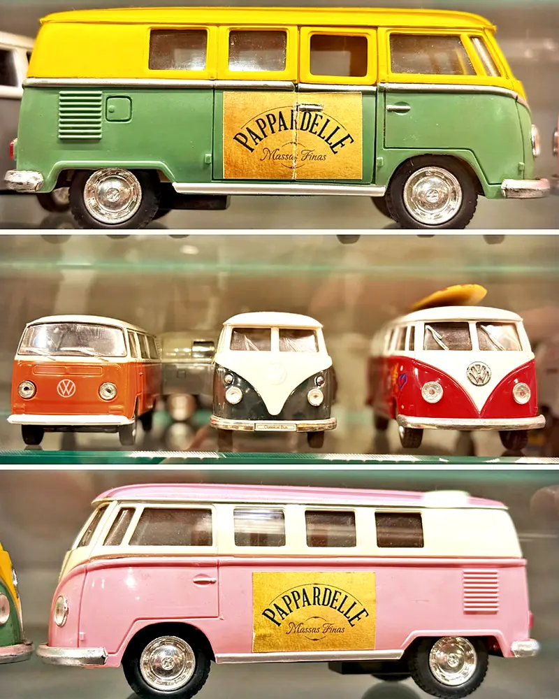 Para ambientação foi escolhida uma decoração vintage onde não faltam curiosidades como rádios antigos, eletrodomésticos, miniaturas de kombis e um imenso lustre feito de taças de vinho penduradas de cabeça para baixo.