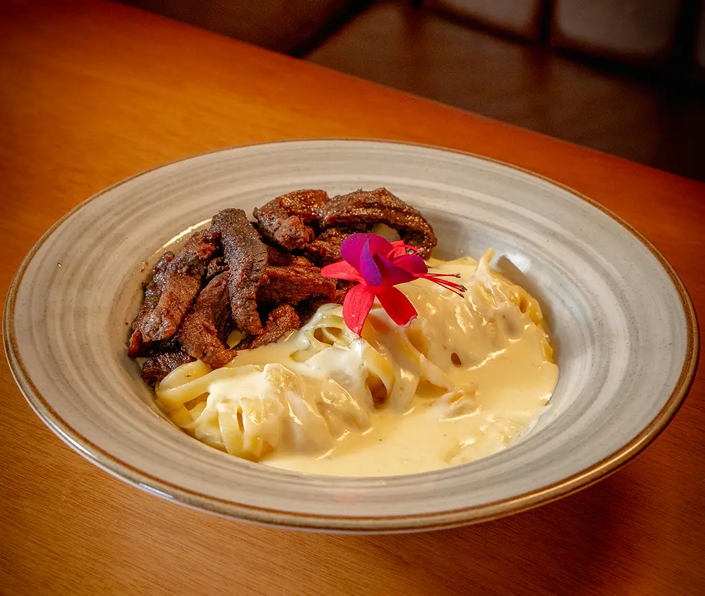 Fettuccine com iscas de carne é uma das opções no cardápio do Bistrô
