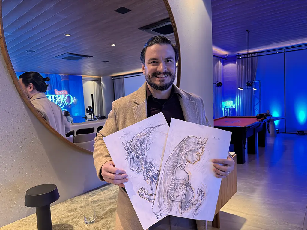 Edu Hoewell com seus desenhos do personagens do Castelo de Gelo, atração que chega
