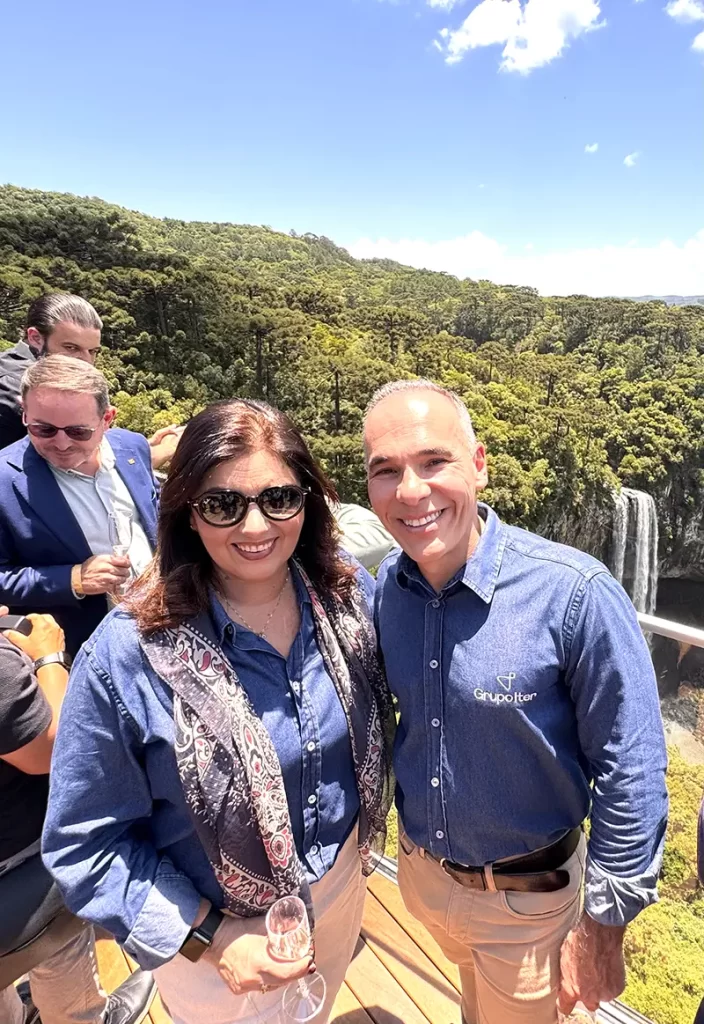 Sandra Ferraz, gerente geral do Parque do Caracol, e Sandro Fernandes CEO do Grupo Iter, administrador do parque do estado, celebram a reabertura do mirante da cascata