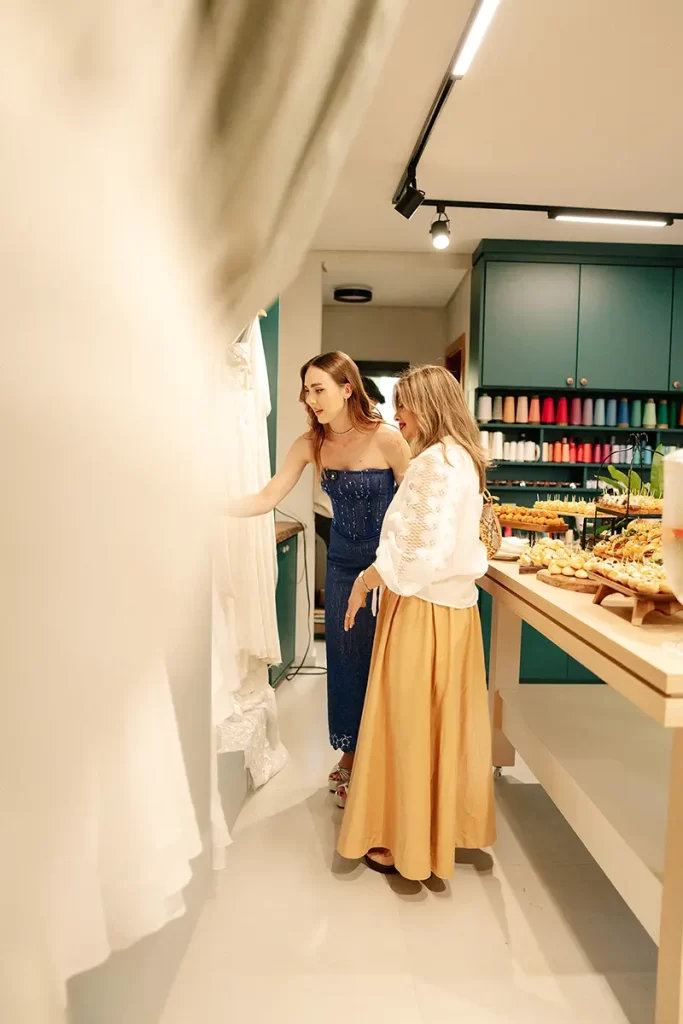 A estilista gramadense Natália Negri com sua cliente Marise Chagas Mocelin conferindo os vestidos autorais