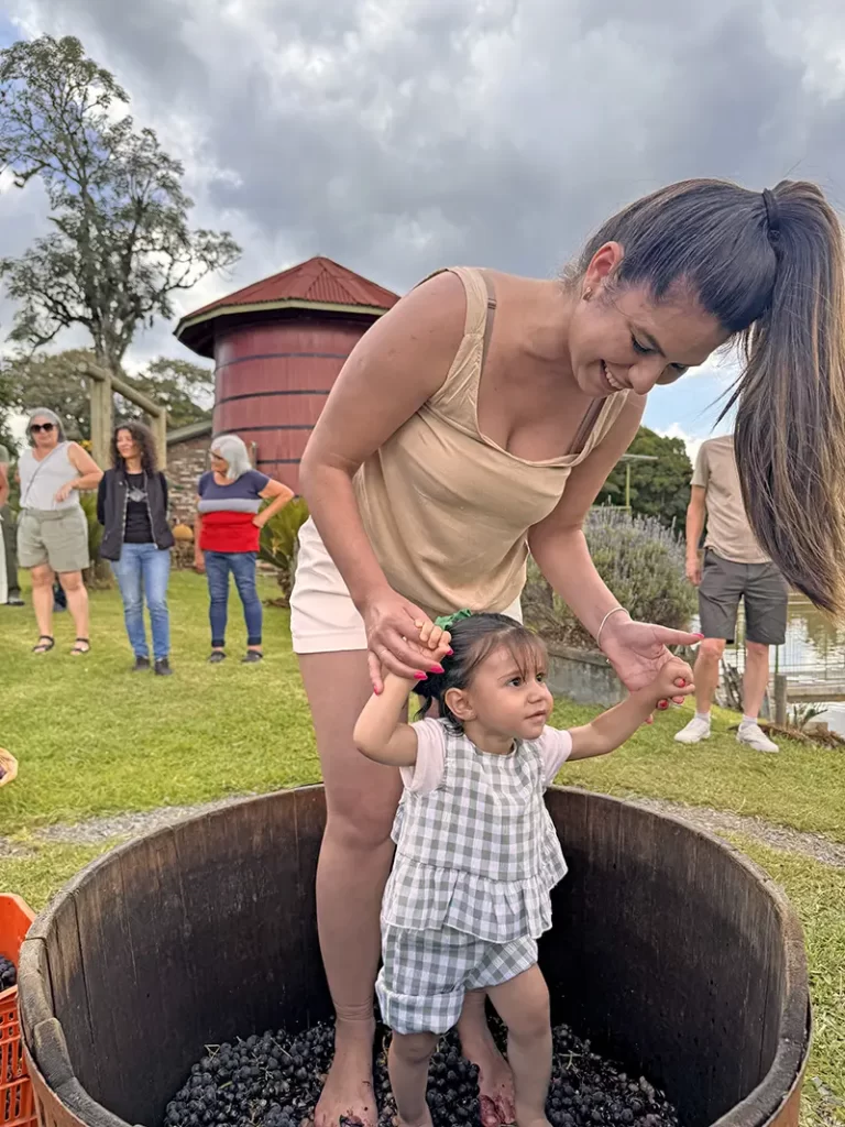 Ingrid Lopes e a filha Catarina em momento divertido de pisar as uvas na vindima da Casa da Tapera
