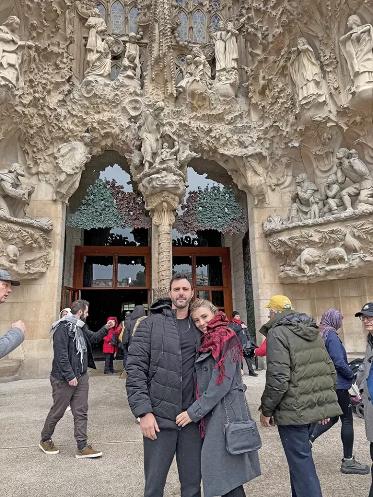Rodrigo Hoffmann e Susan Schaumloeffel na Igreja Sagrada Família, em Barcelona. Em giro pela Espanha, a dupla une férias e negócios