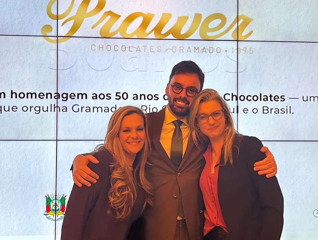 A Assembleia Legislativa do RS prestou homenagem aos 50 anos da Prawer Chocolates. No registro Simone Batistela, o CEO José Augusto Freiberger e Grazi Gabriel