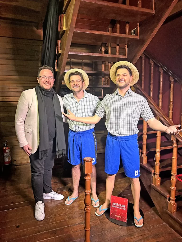 Wesley Matos ladeando Badin “O Colono” ao vivo e a cores, junto do seu personagem de cera, homenageando esta personalidade que foi relevante nas enchentes de 2024 no Dreamland, em Gramado!