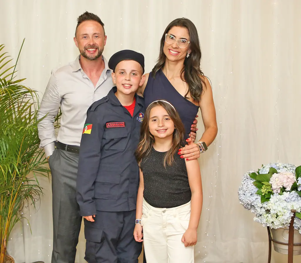 Família Assmann reunida para a formatura de Bombeiro Mirim do Júnior. Na foto com os pais Jair e Bibiane a mana Clara