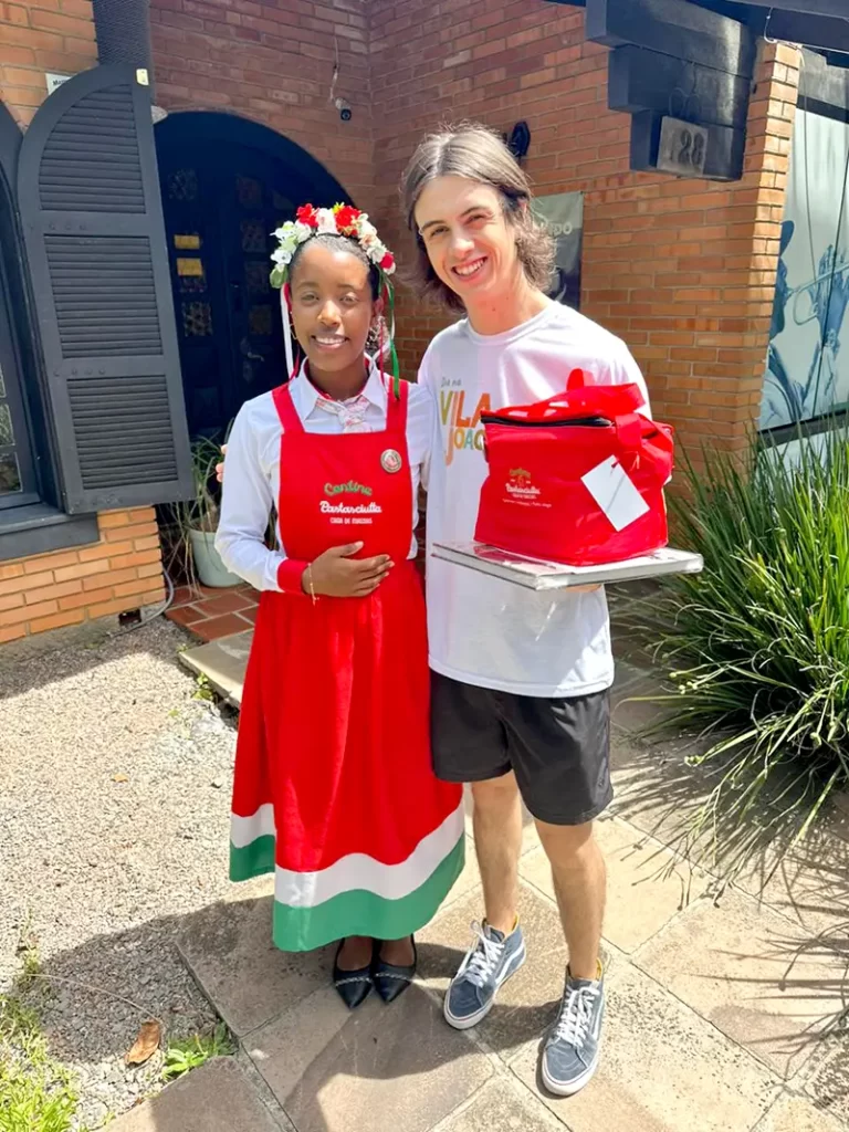 A Italianinha Fabrisi entregou um mimo da Cantina Pastasciutta para o comunicador da Clube FM Jonas Lazaretti. Ele foi um dos homenageados pela descendência italiana, festejada no dia 21 deste mês em uma ação tradicional da Famiglia