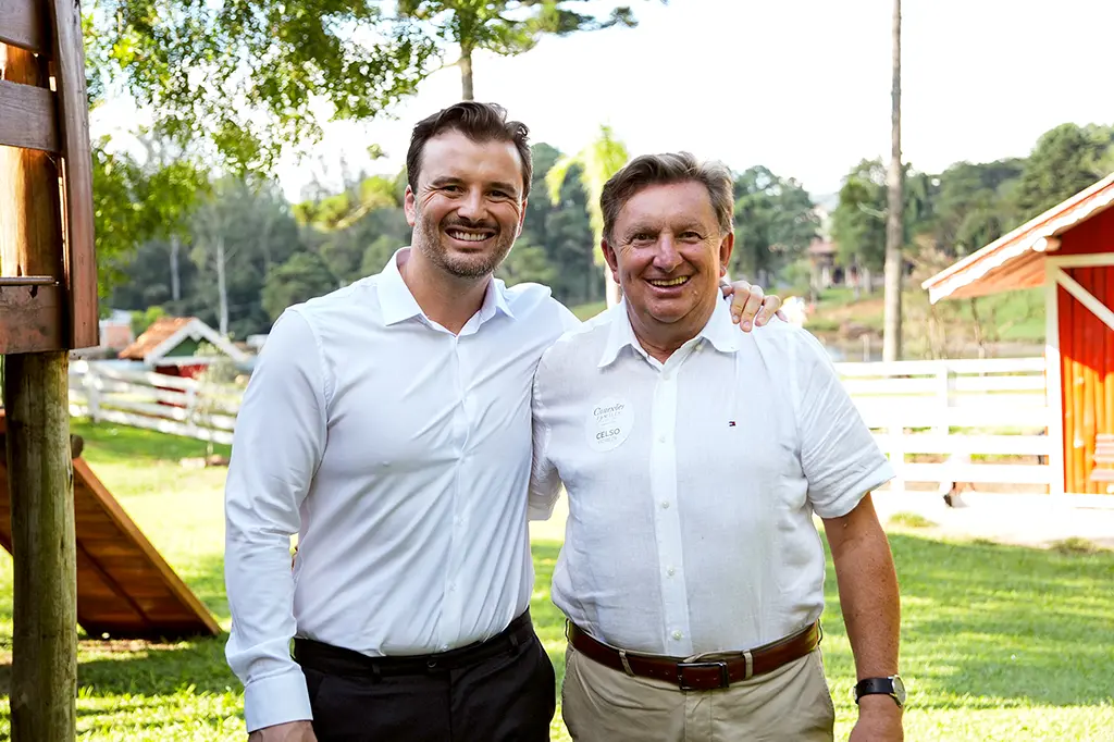 Felipe e Celso Fioreze em comemoração pelo sucesso da terceira edição do evento Conexões Família Fioreze, que aconteceu no último fim de semana, na Casa de Eventos da Família Fioreze