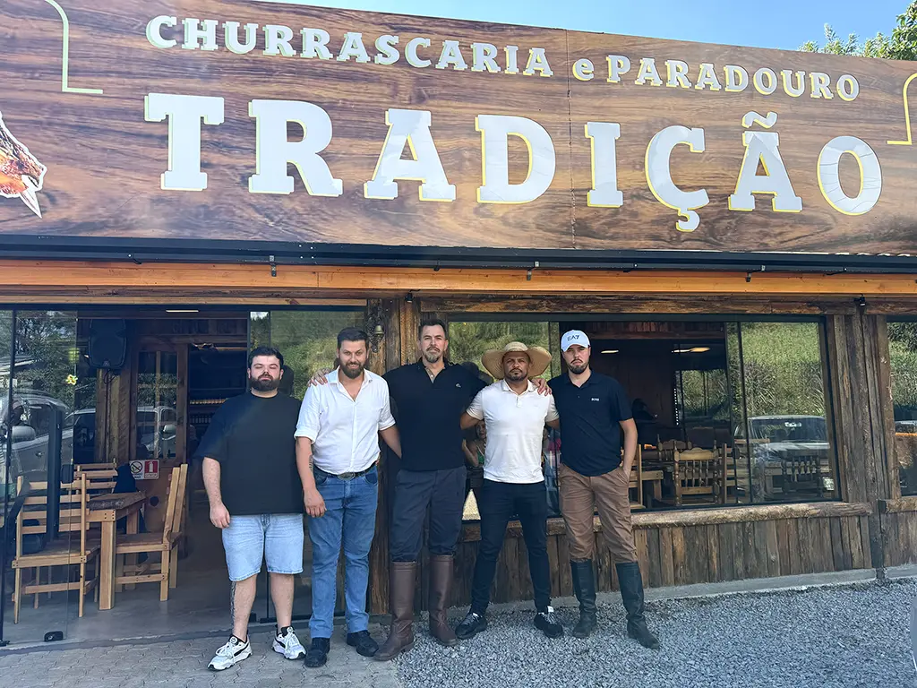 Os sócios da Churrascaria e Paradouro Tradição Júlio Enzweiler, Charles Sganderla, Fábio Boher Camargo, Fred Douglas Oliveira e Willian Boher Camargo, na inauguração do empreendimento que está localizado no interior de Gramado e tem funcionamento diário das 9h às 22h