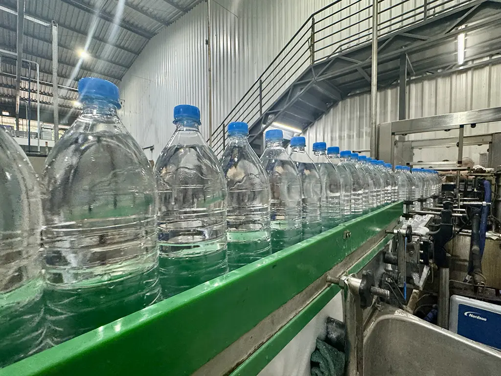 Todo o sistema funciona em circuito fechado, onde a água segue diretamente da fonte para reservatórios de inox e, depois, para as linhas de envase, sem contato externo.