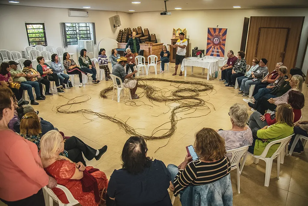O kaingang Valdecir Fatã ensina a trançar um cesto com cipó, no Salão Paroquial em Canela